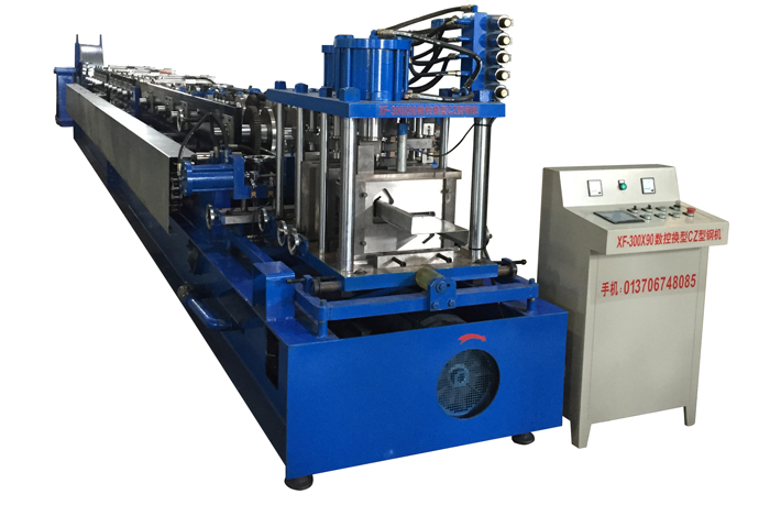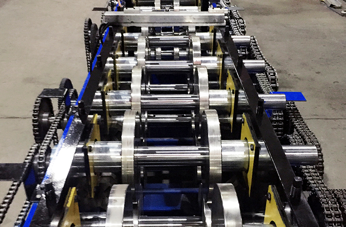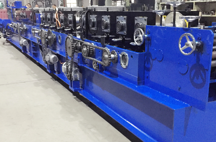 3、成型主機:機架用450H鋼焊接而成,機組長度為11米,寬度為1.4米,高度為1.2米,整機重量為18噸,采用電動調節規格方式,換模時間2分鍾。軋製規格為寬度100-300mm,高度為40-90mm,壓製板材質Q235,厚度為2.0-3.0mm,成型速度為35米/分,主機十六道滾壓成型,輪子材料為Cr12MoVi優質合金鋼,淬火硬度為HRC60-62,輥軸材料為Ф70圓45#優質碳素鋼,經調質處理,硬度為HRC28~32。